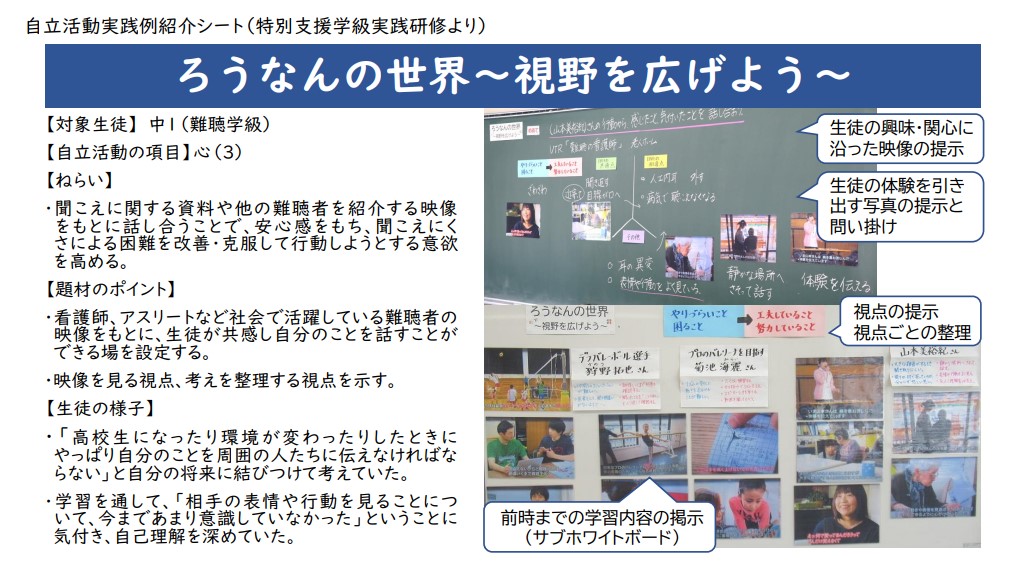 この活動は、中学校の難聴学級の生徒を対象に、社会で活躍する難聴者の姿を通して、生徒が、自身の障害や将来について前向きに考え、自己理解を深めることを目的としています。看護師やアスリートなど、生徒の興味・関心に沿った映像の視聴を通して、共感したことや自分のことについて話しました。