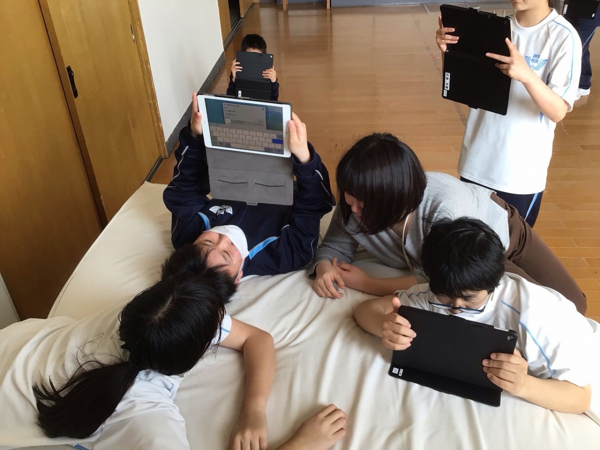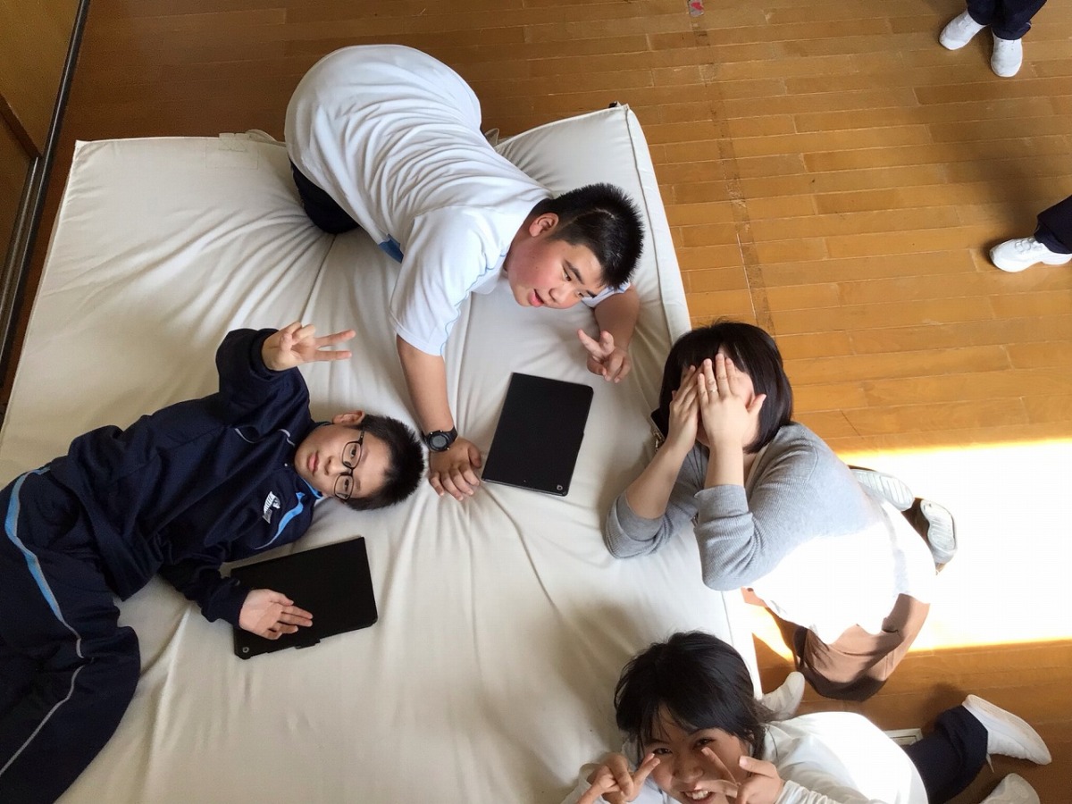 「楽しそうにマットに寝転んでいる友達」
